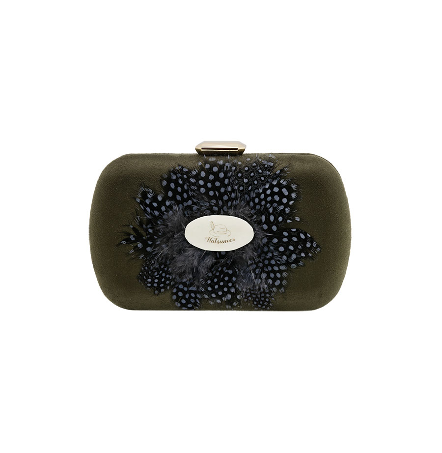 Clutch redondeado verde botella con detalle de flor realizada con plumas a lunares y placa de hueso grabada Hatsunver. Terciopelo suave al tacto, cierre de broche y correa de cadena de quita y pon.