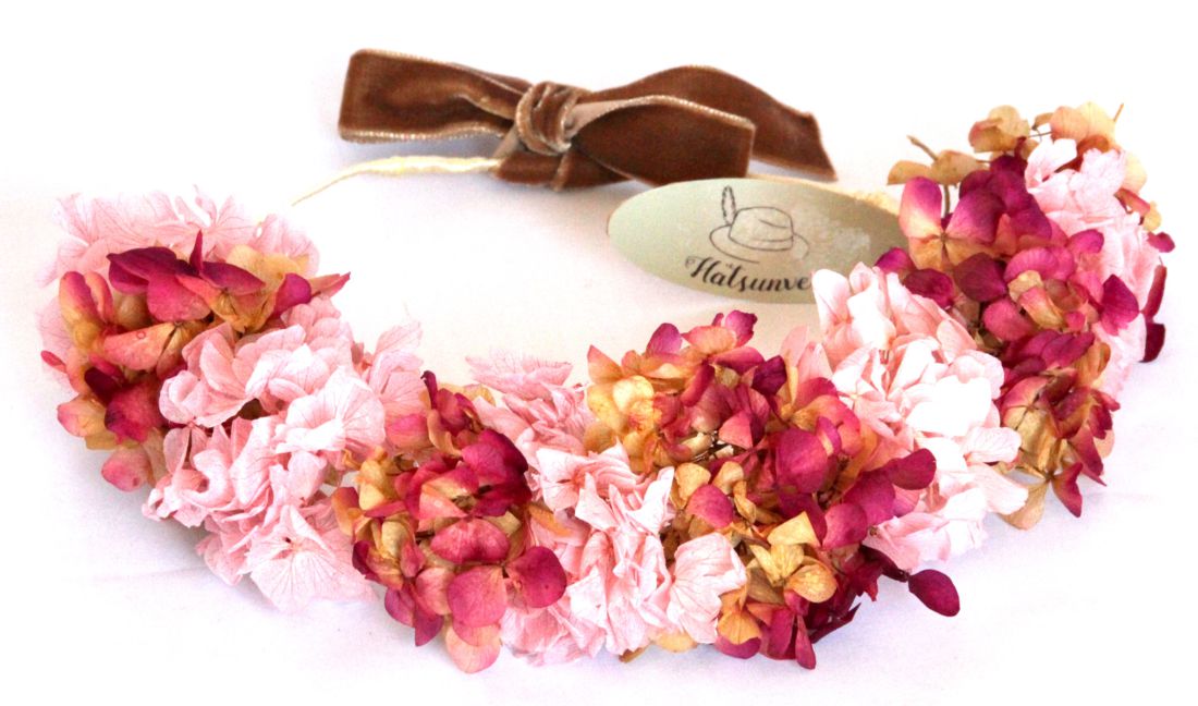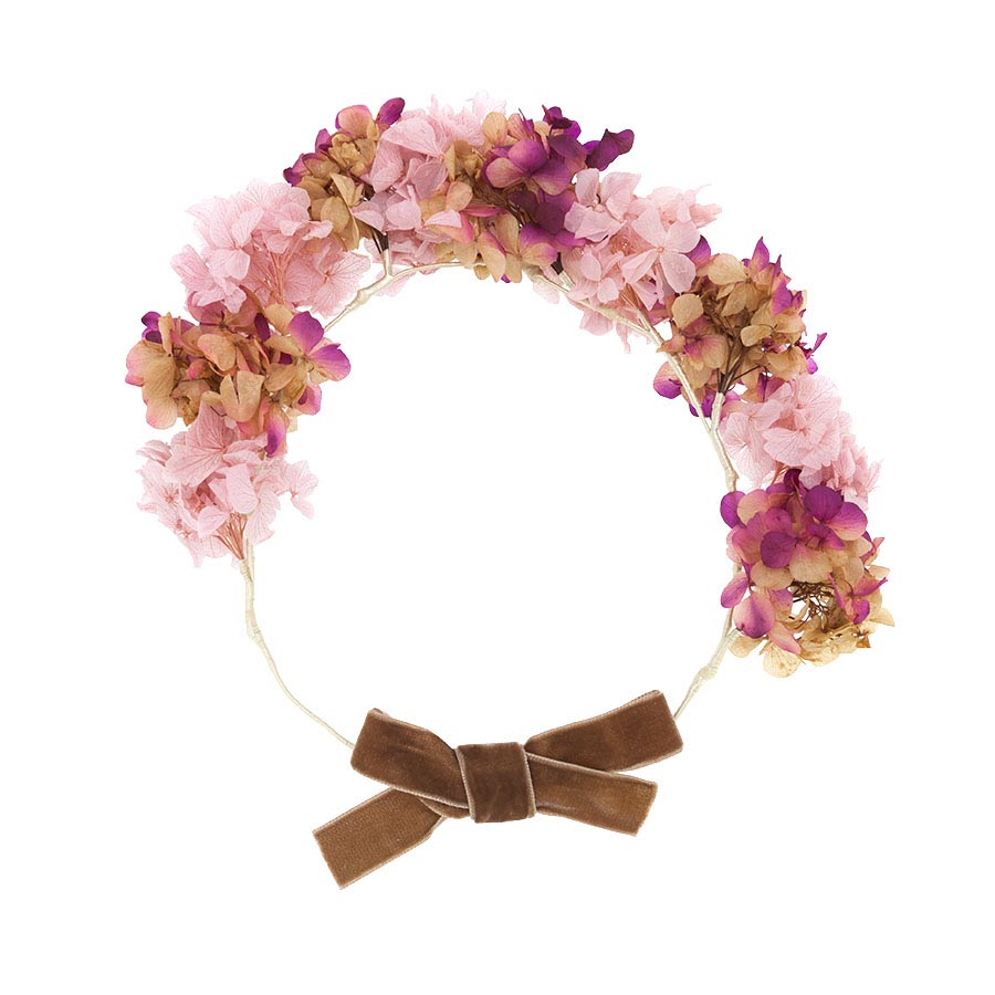 Corona realizada con hortensias preservadas en tonos rosa y buganvilla con toques dorados. Acabada con un lazo de terciopelo marrón.
