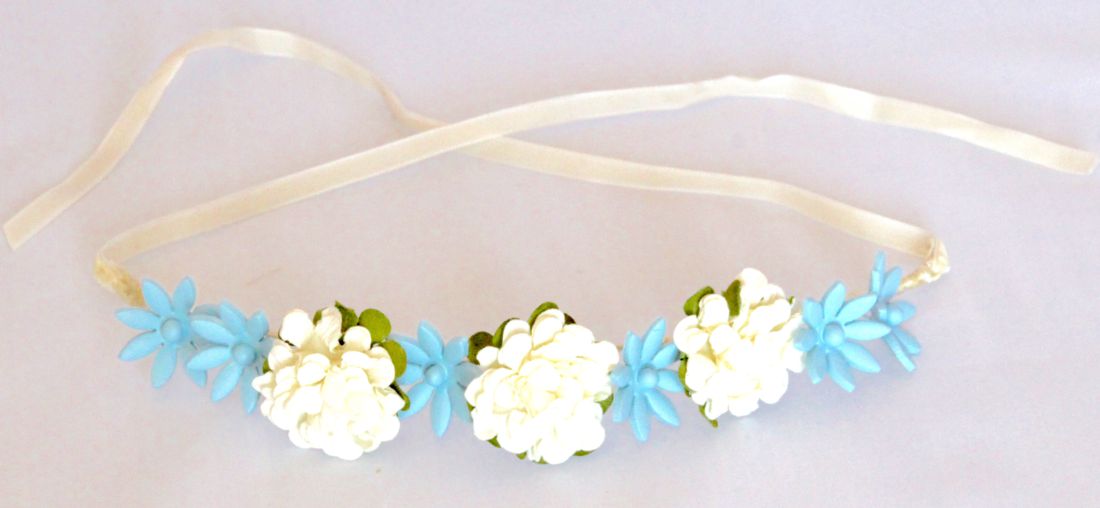 Media corona realizada con margaritas de tela en color blanco y margaritas celestes de porcelana fría. Acabada en lazo de raso estrecho en blanco roto.