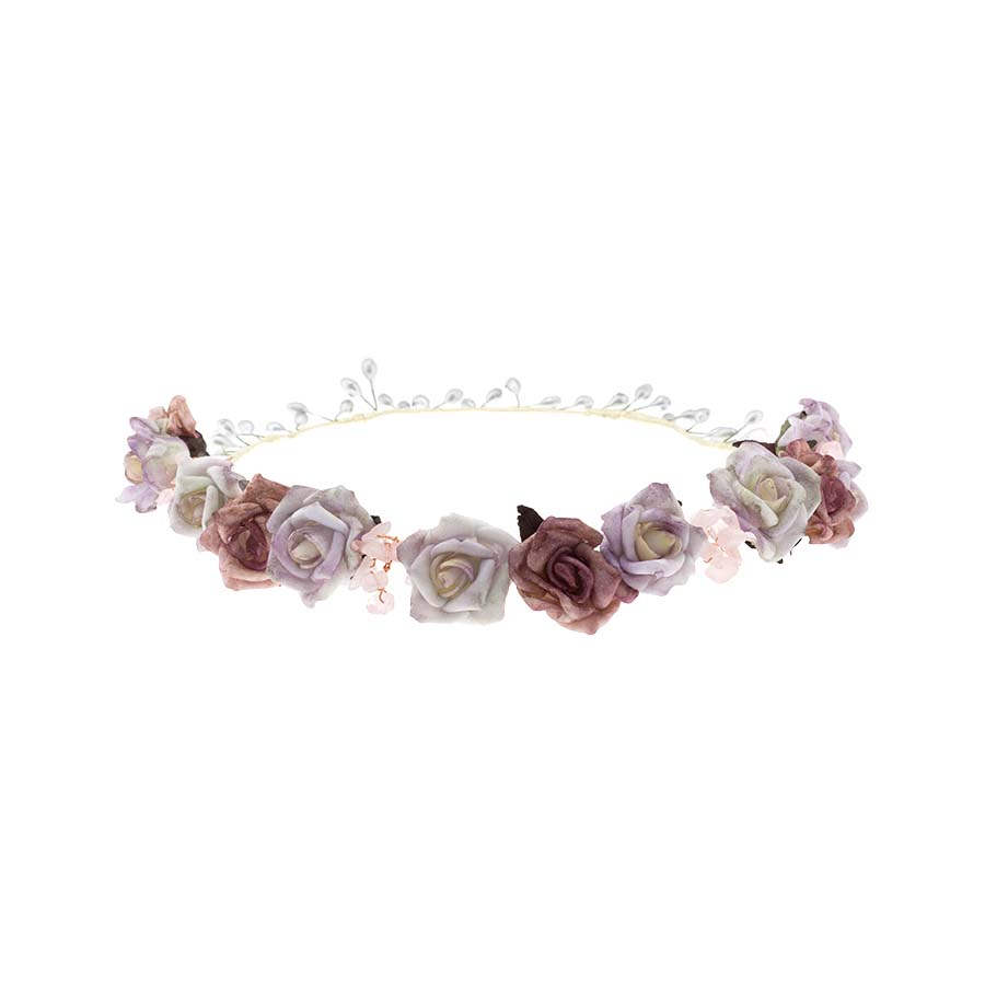 Corona realizada con mini rosas de papel rosa palo y morado empolvado, entrelazado con cristalitos rosas. Acabado en lágrimas grises realizadas con porcelana fría.