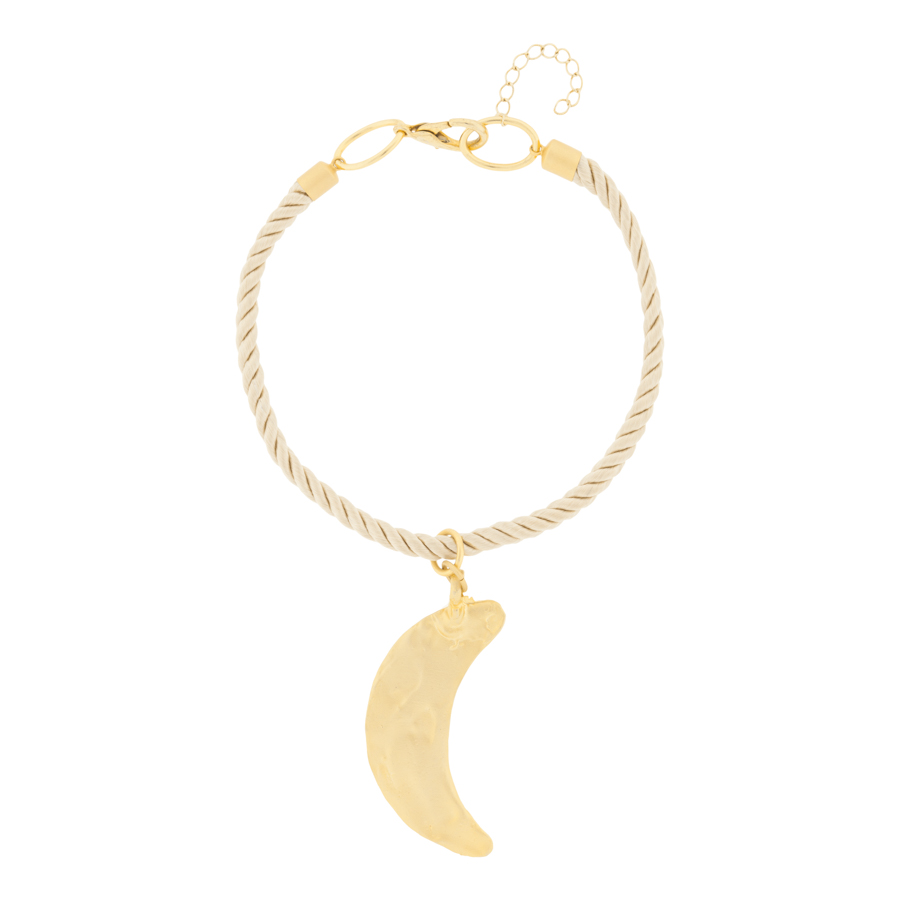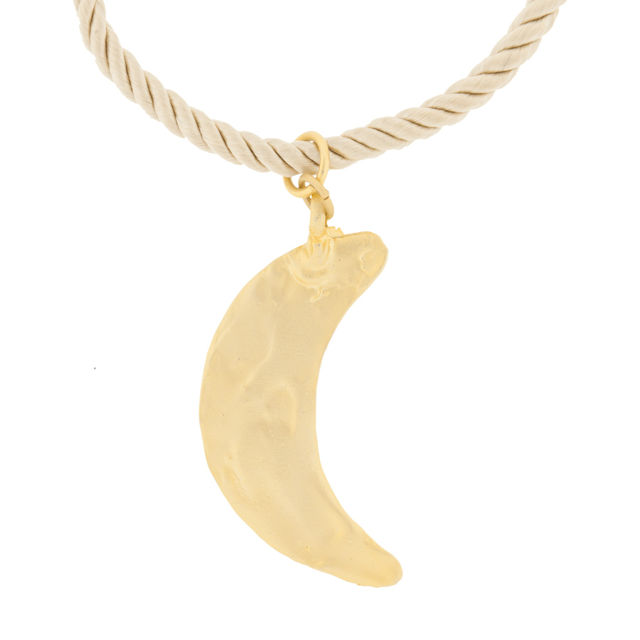 Luna de latón con baño de oro acabado en oro mate. Cierre y anillas en baño de oro acabado en mate.