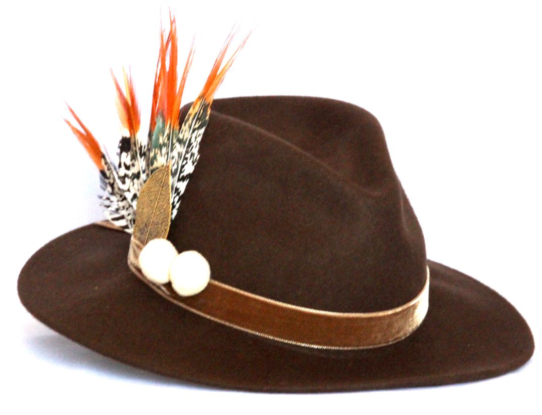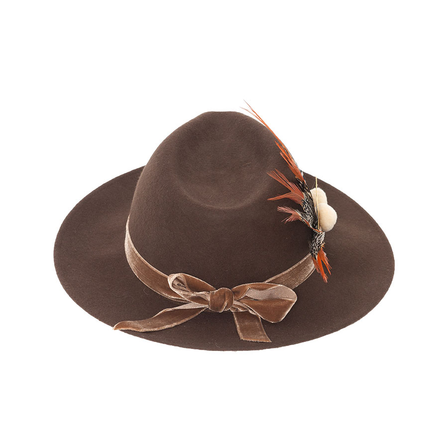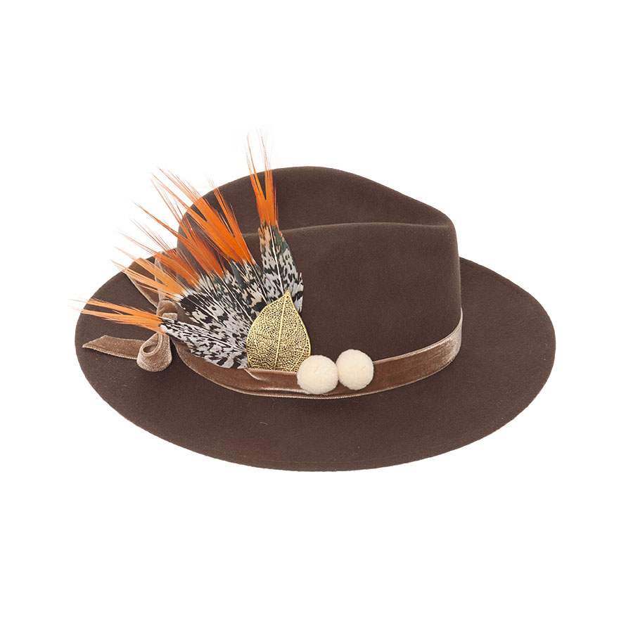 Sombrero de lana 100% europea. Destaca el color marrón decorado con cinta de terciopelo beige finalizado en la parte posterior con un lazo, en el lateral aparecen dos pompones y hoja dorada metalizada.