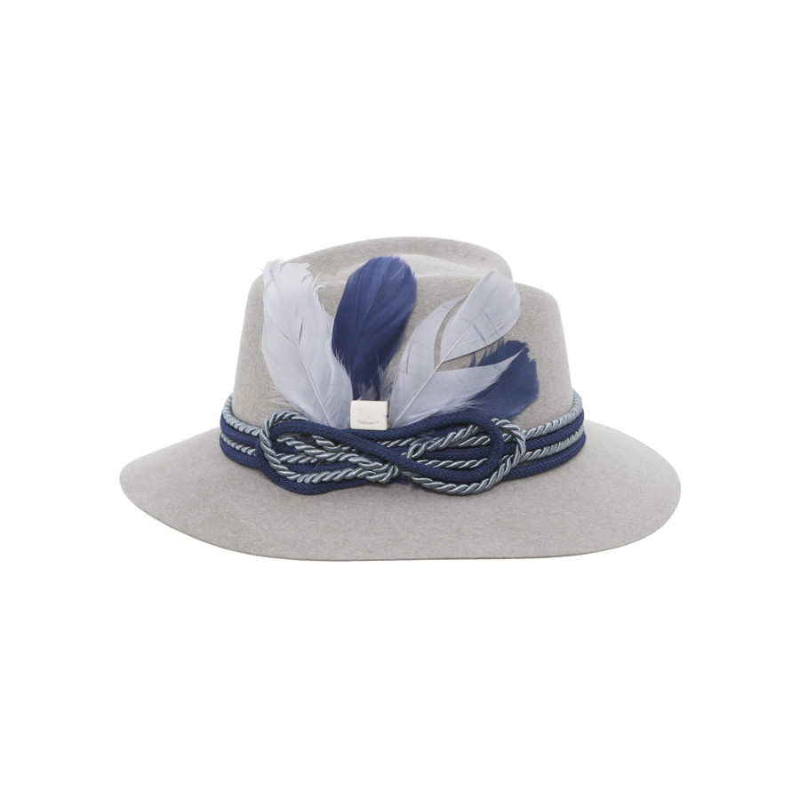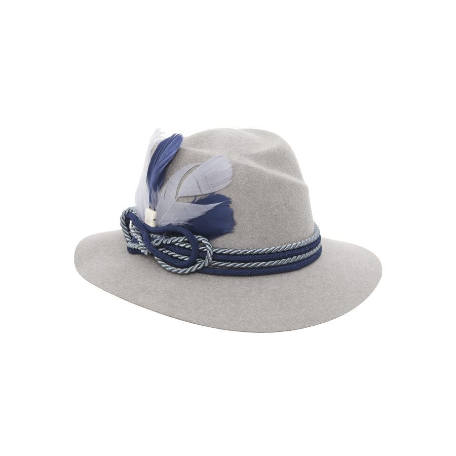 Sombrero 100% pelo de conejo, tacto muy suave. Ala de 6 cm y la copa de forma redondeada con un original pliegue en la parte frontal, tiene 10 cm en los lados y la parte trasera y delantera 8 cm.