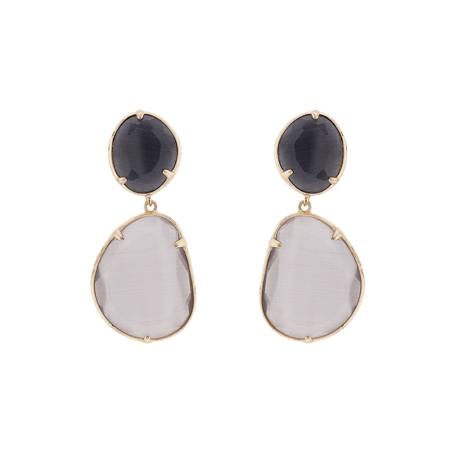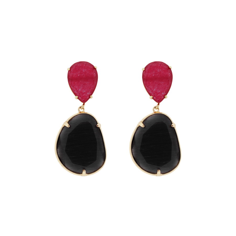 Pendientes realizados con dos piedras de cristal tallado con bisel de latón. Dichas piedras son de color negro y gris o fucsia y negro.