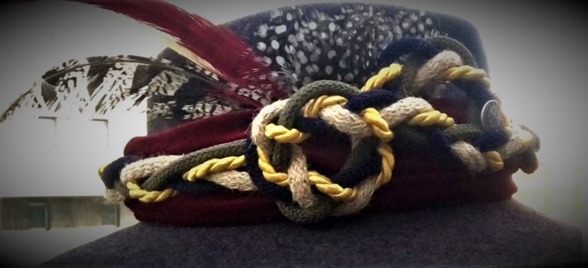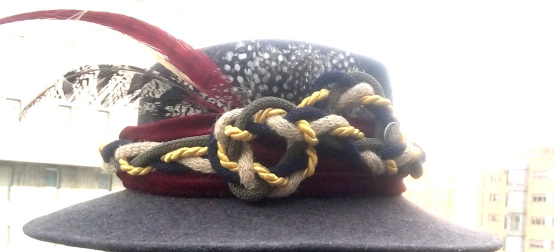 Sombrero de lana 100% europea. Destaca el color gris decorado con cinta ancha de terciopelo burdeos y una hermosa trenza de cuatro colores: cordón trenzado de seda amarrillo, rayón trenzado en verde y azul marino y cuerda natural rematado con un detalle de botón metálico.