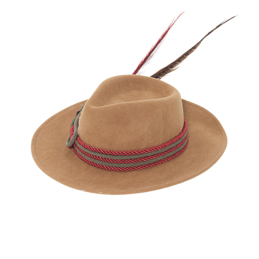 Sombrero de lana 100% europea. Destaca el color beige natural decorado con cordón trenzado de seda en color burdeos, rayón trenzado en kaki terminado con un botón metálico.