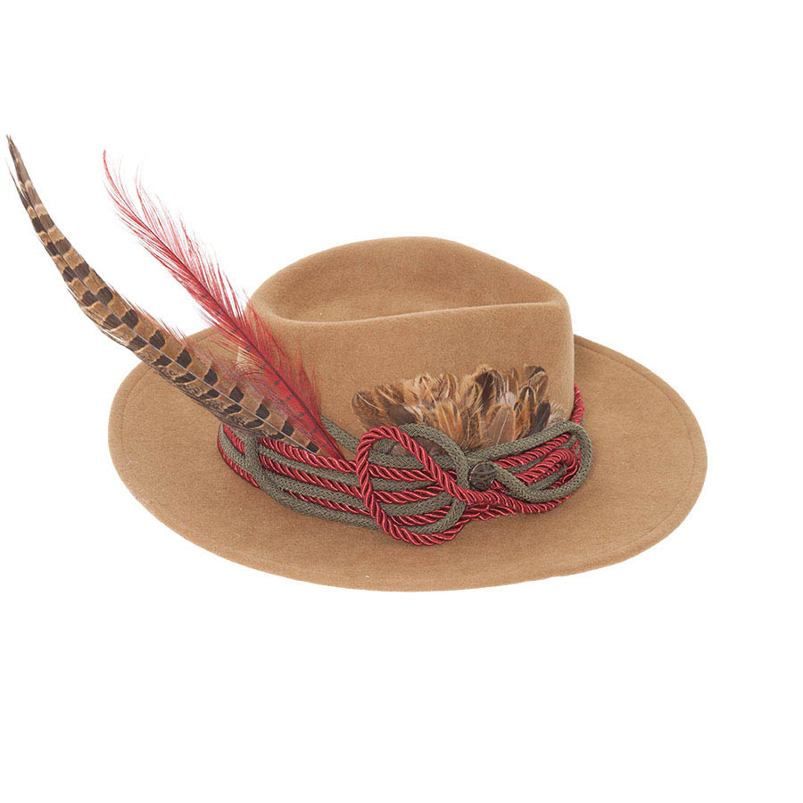 Rematado en el lateral con pluma de perdiz y dos plumas de faisán, una en color natural y la otra en burdeos.