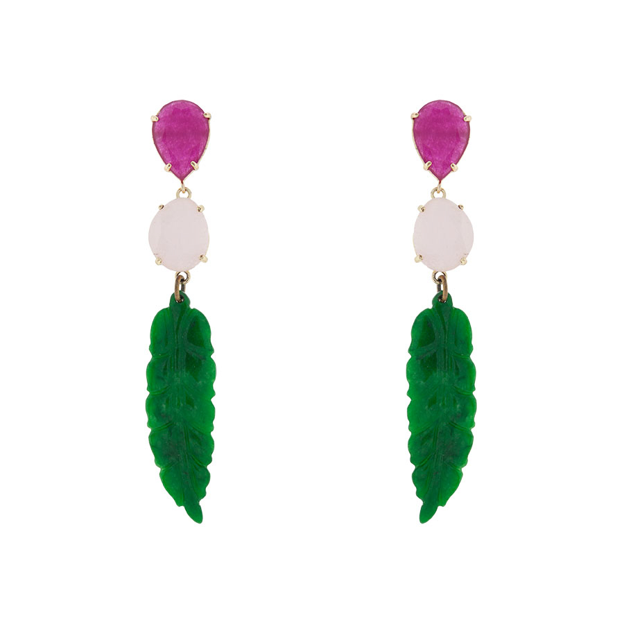 Pendientes realizado con dos piedras talladas en color fucsia y rosa terminado en una hoja de jade.