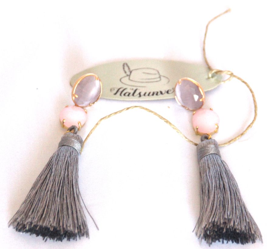 Pendientes con dos piedras de cristal tallado con bisel de latón y pompón en color gris.