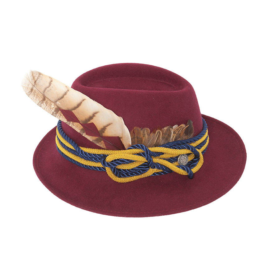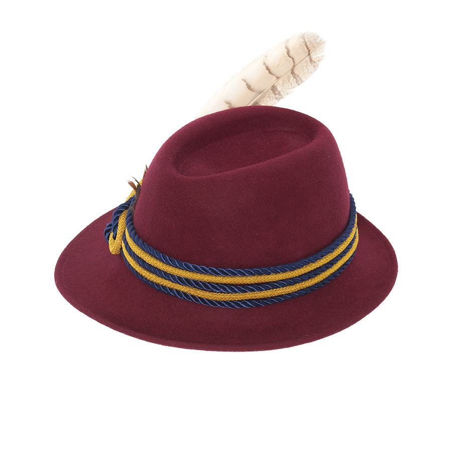 Sombrero de lana 100% europea. Destaca el color burdeos decorado con cordón trenzado de seda en color azul marino y rayón trenzado en color oro, terminado con el detalle de un botón metalizado.