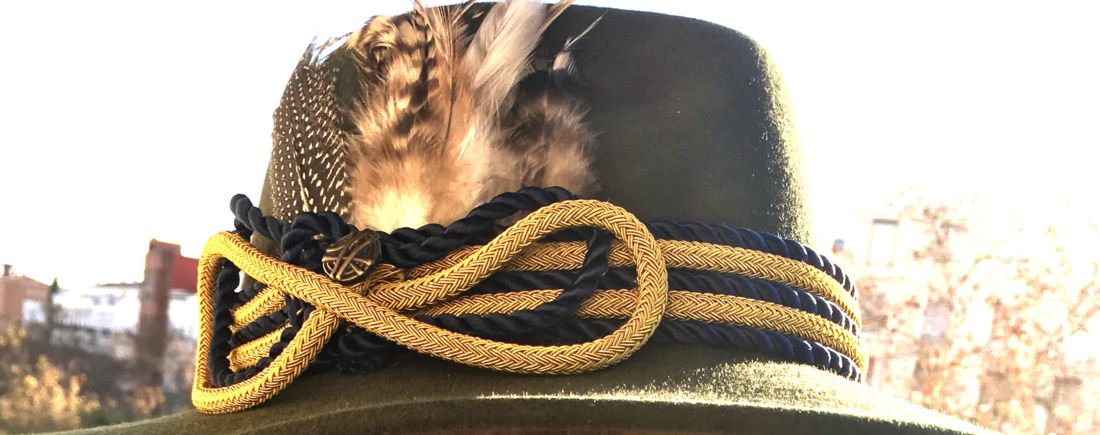 Sombrero de lana 100% europea. Destaca el color verde caza decorado con una ancha combinación de cordones; cordón trenzado de seda en azul marino y rayón trenzado en oro, terminado con el detalle de un botón metálico.