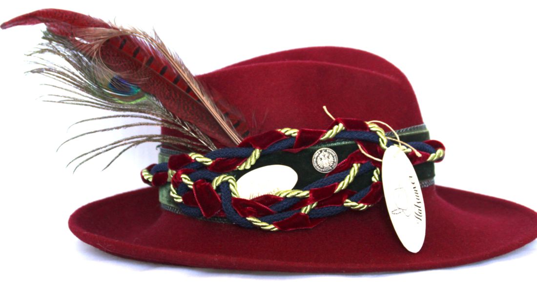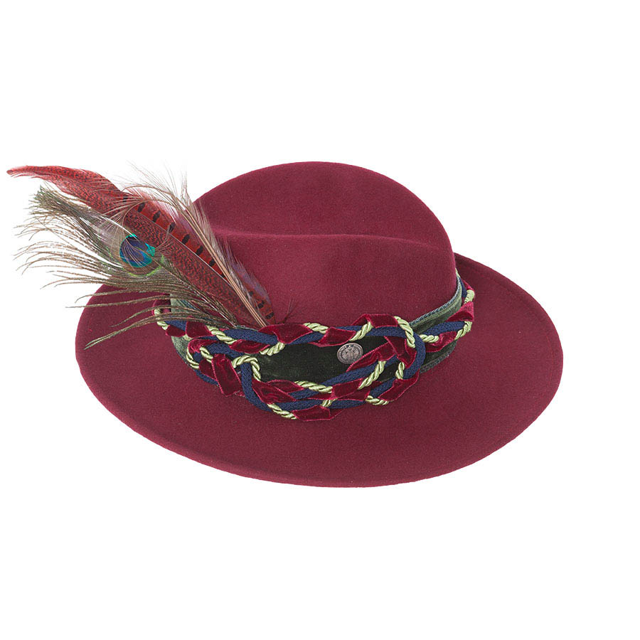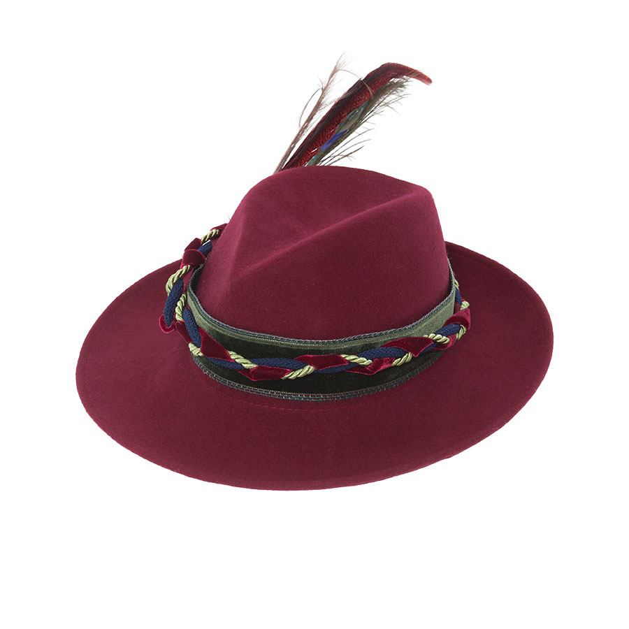 Sombrero de lana 100% europea. Destaca el color burdeos decorado con cinta ancha de terciopelo verde botella, una trenza cosida realizada con cinta estrecha de terciopelo burdeos, cordón trenzado de seda amarilla y rayón trenzado azul marino, terminado con el detalle del botón metálico y placa de hueso con logo grabado.