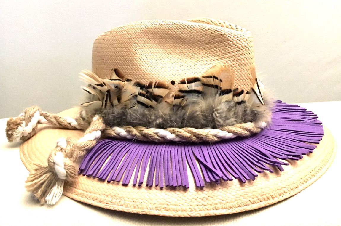 Sombrero de panamá en color natural, decorado con un diseño en el que destacan la calidad de los materiales como son la cuerda natural en tono crudo/beige, los flecos de ante en color morado y las plumas de faisán naranja.