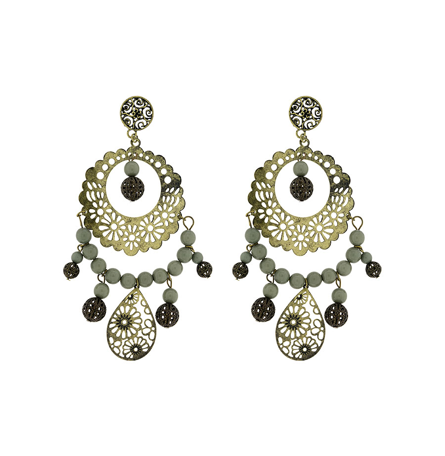 Pendiente de latón viejo, en el cuelgan lagrimas de latón y bolas de color gris. Muy ligero y cómodo.