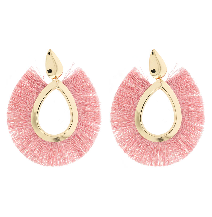 Pendiente de latón ovalado con flecos en rosa. A pesar de ser largos no pesan nada, muy cómodos e ideales para dar luz a tus looks.