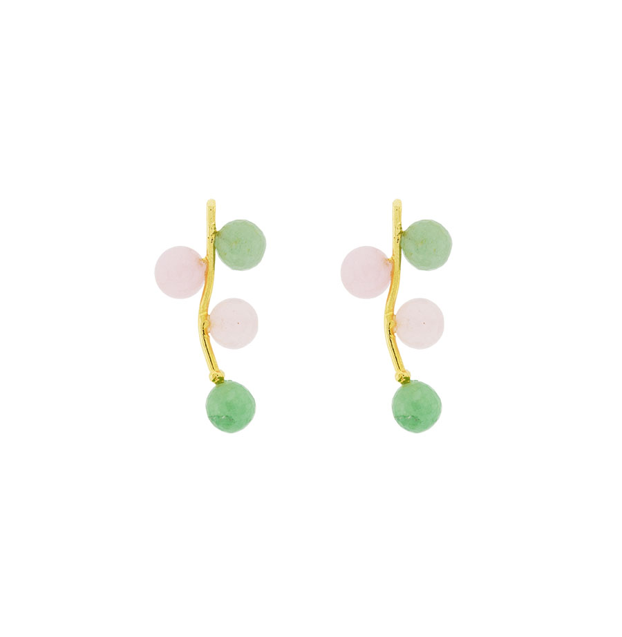 Pendiente alargado de latón con baño en oro, decorado con bolas de piedra tallada rosa y verde .