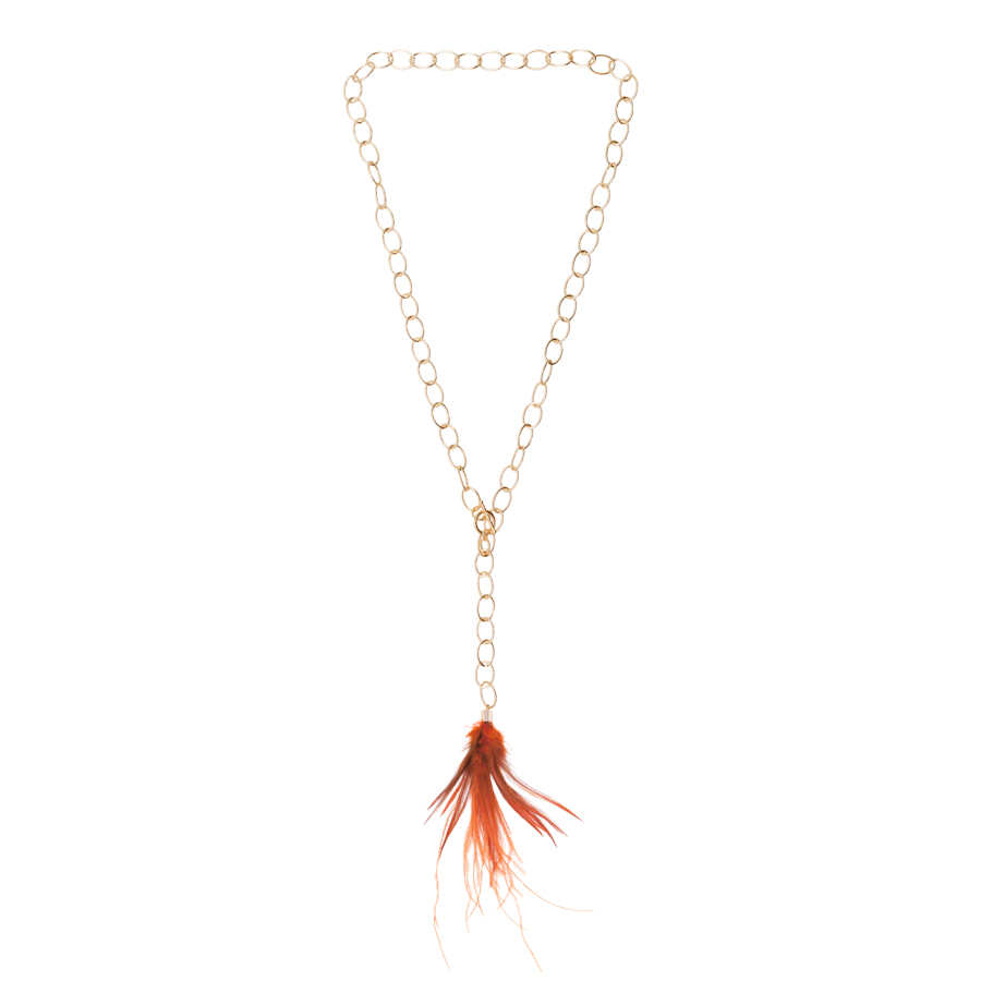 Realizado con cadena de latón con baño de oro acabado en rosa brillo y cierre en forma de T. Modelo acabado en plumas Naranjas con capuchón en baño de oro rosa, más colores disponibles.